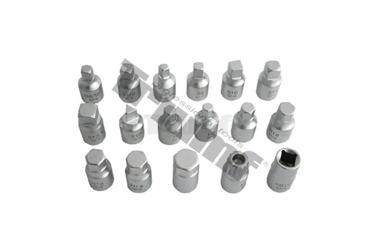 • sada obsahuje: 4-hran venkovní velikosti: 8 - 11 - 13 mm - 5/16" - 3/8", 6-hran venkovní velikosti: 8 - 9 - 10 - 12 - 14 - 17mm - 5/16" - 3/8" - 1/2", 3-hran venkovní 10 mm pro vozidla Renault, XZN 16 s otvorem pre vozidla VW, 4-hran vnitřní 10 mm pro vozidla BMW, Ford, Toyota