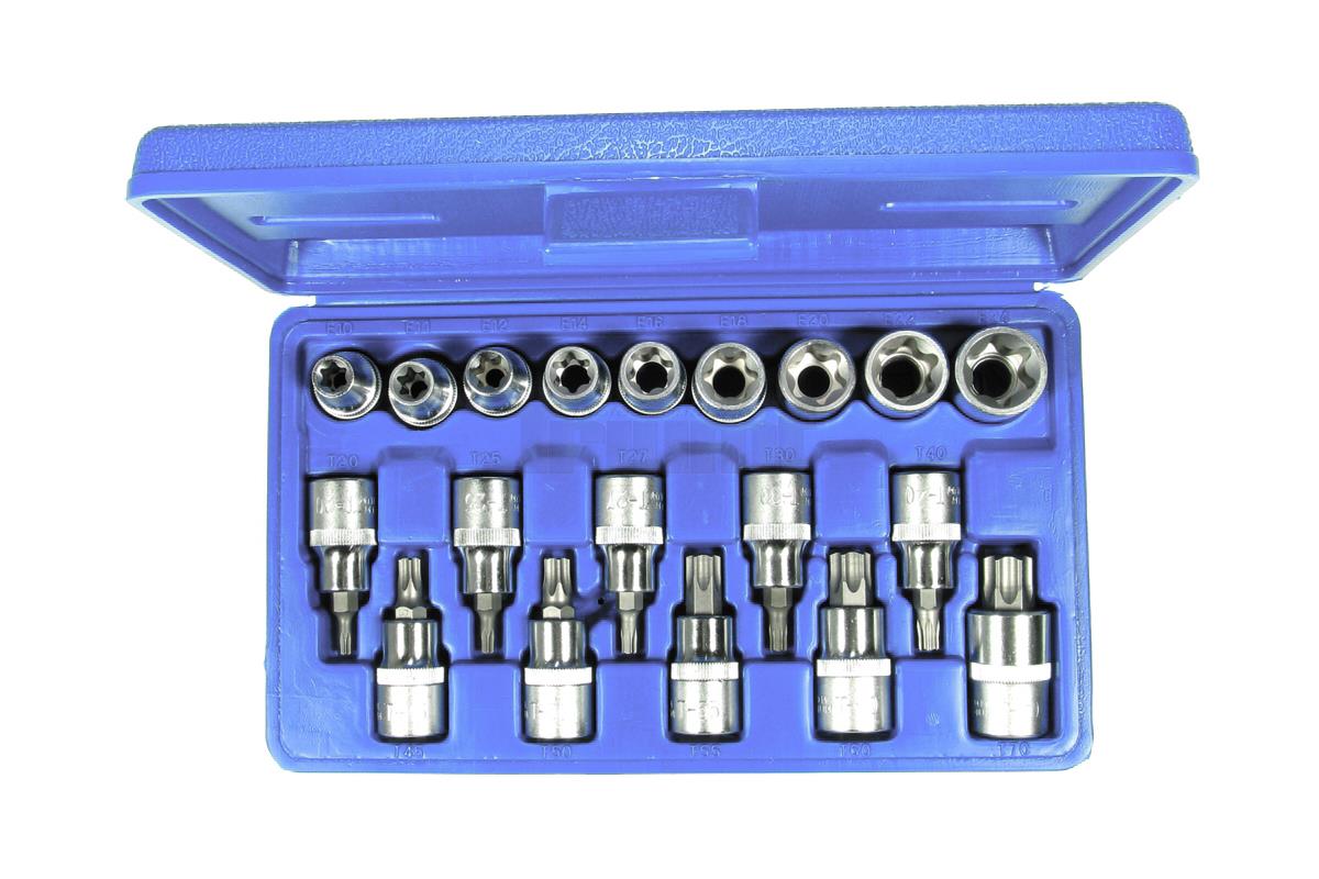 hlavice zástrčné a nástrčné 1/2", Torx T20 - T70, E-profil E10 - E24, sada 19 dílů