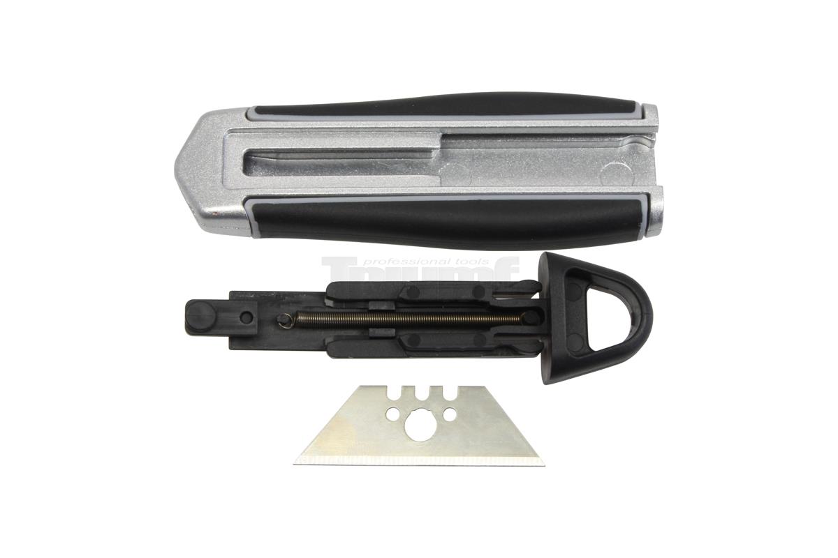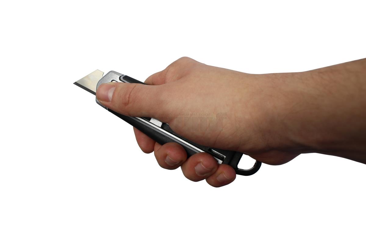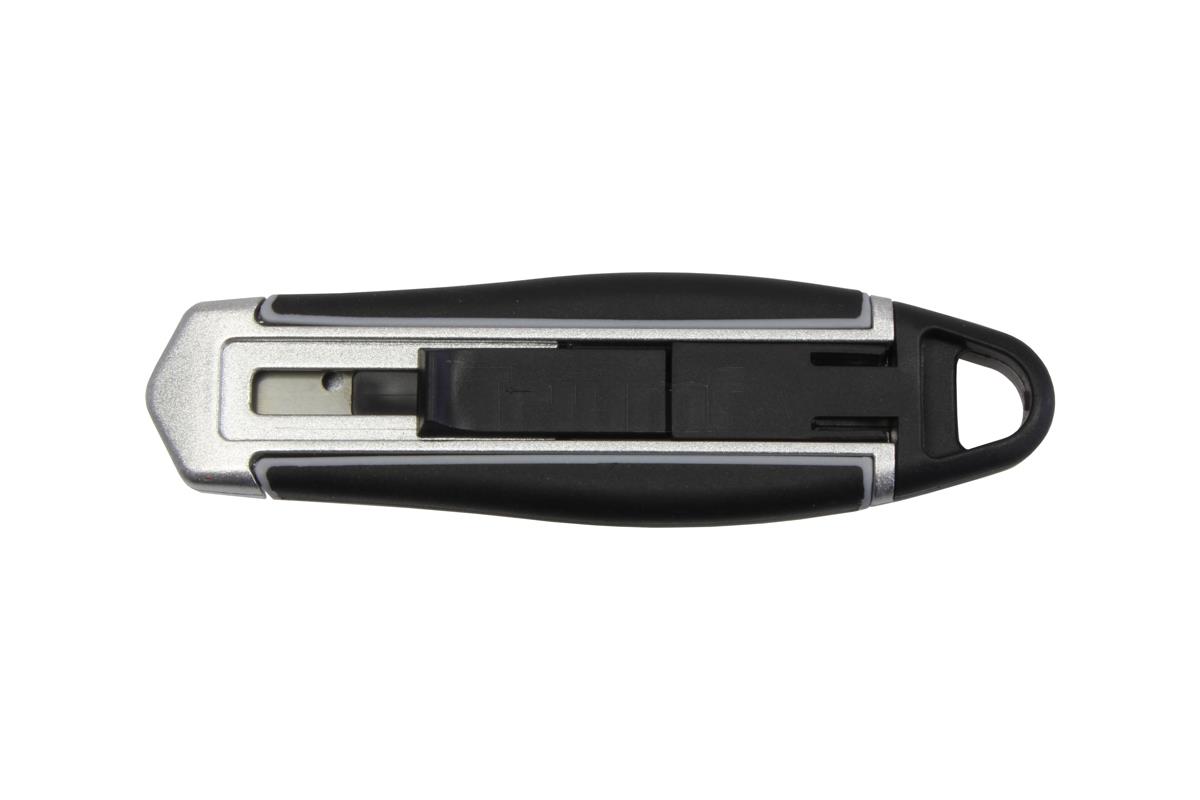 • Bezpečnostní nůž je oblíbený mezi uživateli pro jednoduchý design a masivní rukojeť. Předností je spolehlivá pružina ovládající čepel, bezpečná a rychlá výměna čepele. Kovové tělo je vyrobeno z lehké slitiny a je opatřené pryžovou rukojetí, jež zamezuje prokluzování nože a zajišťuje vyšší komfort při práci.