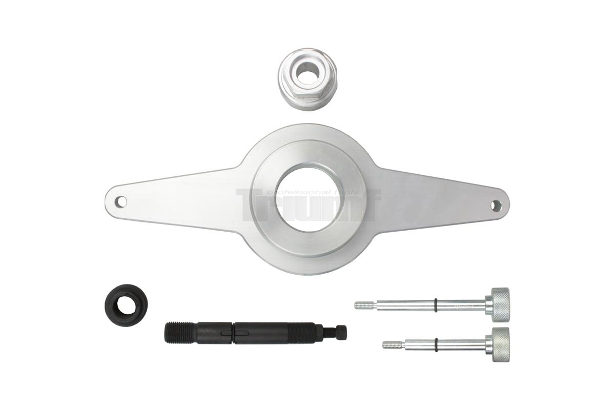 • Sada přípravků na montáž a demontáž tlumiče vibrací a pro nastavení klikové hřídele koncernových vozidel VW s benzinovými motory 1,8 l a 2,0 l TSI / TFSI. Sada je určená pro aretaci rozvodů při demontáži tlumiče vibrací klikové hřídele, který je zajištěn ve správné poloze pouze tlakem centrálního šroubu na klikové hřídeli. Při demontáži středového šroubu se rozvodové kolo volně otáčí a při jeho nearetování by se časování rozvodů rozladilo.