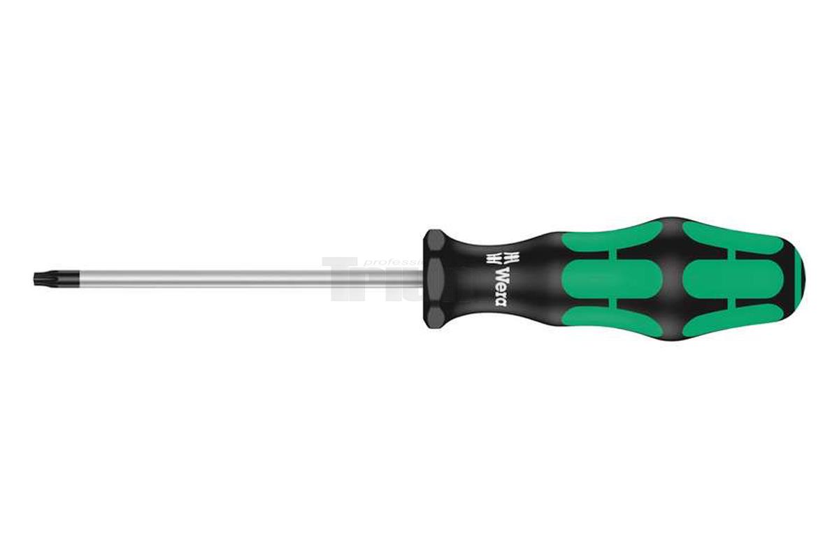 • Kvalitní šroubovák Kraftform Plus. Vícekomponentní rukojeť Kraftform pro rychlou a bezpečnou práci. Kraftform Plus: tvrdé zóny rukojeti pro vysokou pracovní rychlost, zatímco měkké zóny rukojeti zajišťují přenos vysokých utahovacích momentů. Špička profilu Black Point Wera a náročný proces kalení zaručují dlouhou životnost špičky, zvýšenou ochranu proti korozi a vysokou přesnost. S identifikátorem nářadí „Take it easy": Barevné označení podle profilů a značky velikosti. Šestihranná ochrana před odkutálením brání nepříjemnému kutálení nářadí na pracovišti.